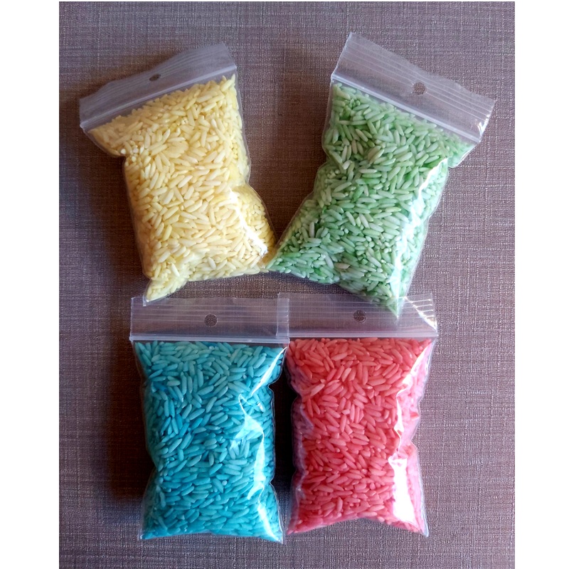 4 zakjes gekleurde rijst, groen, rood, blauw en geel á 50 gram om te gebruiken bij de vulvormen.